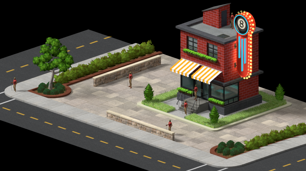 Town in 3D: This is the 3D version of the town. It’s nearing completion, with some remaining set dressing and paint-over work to be added. This was created by a 3D artist on the team.