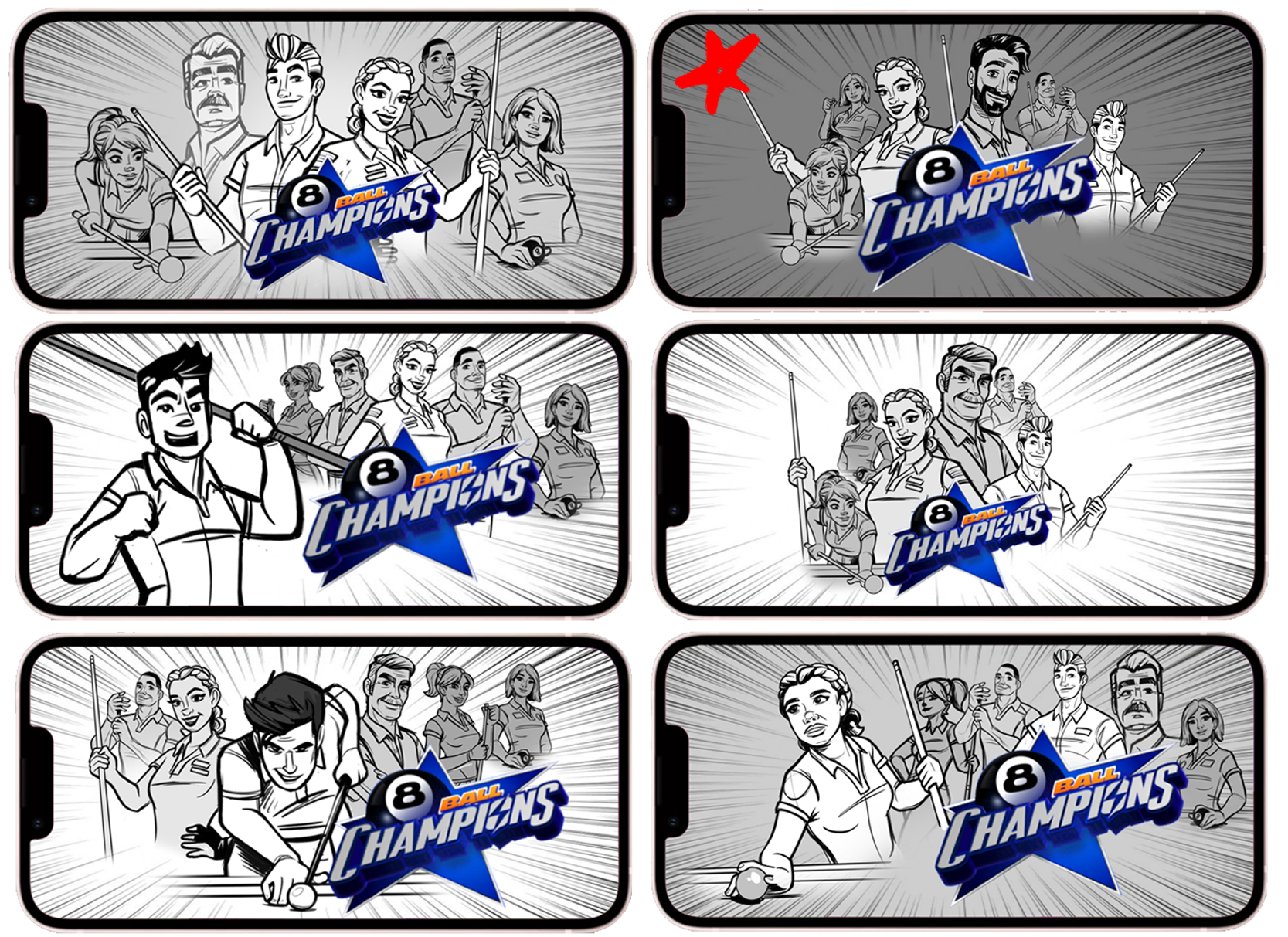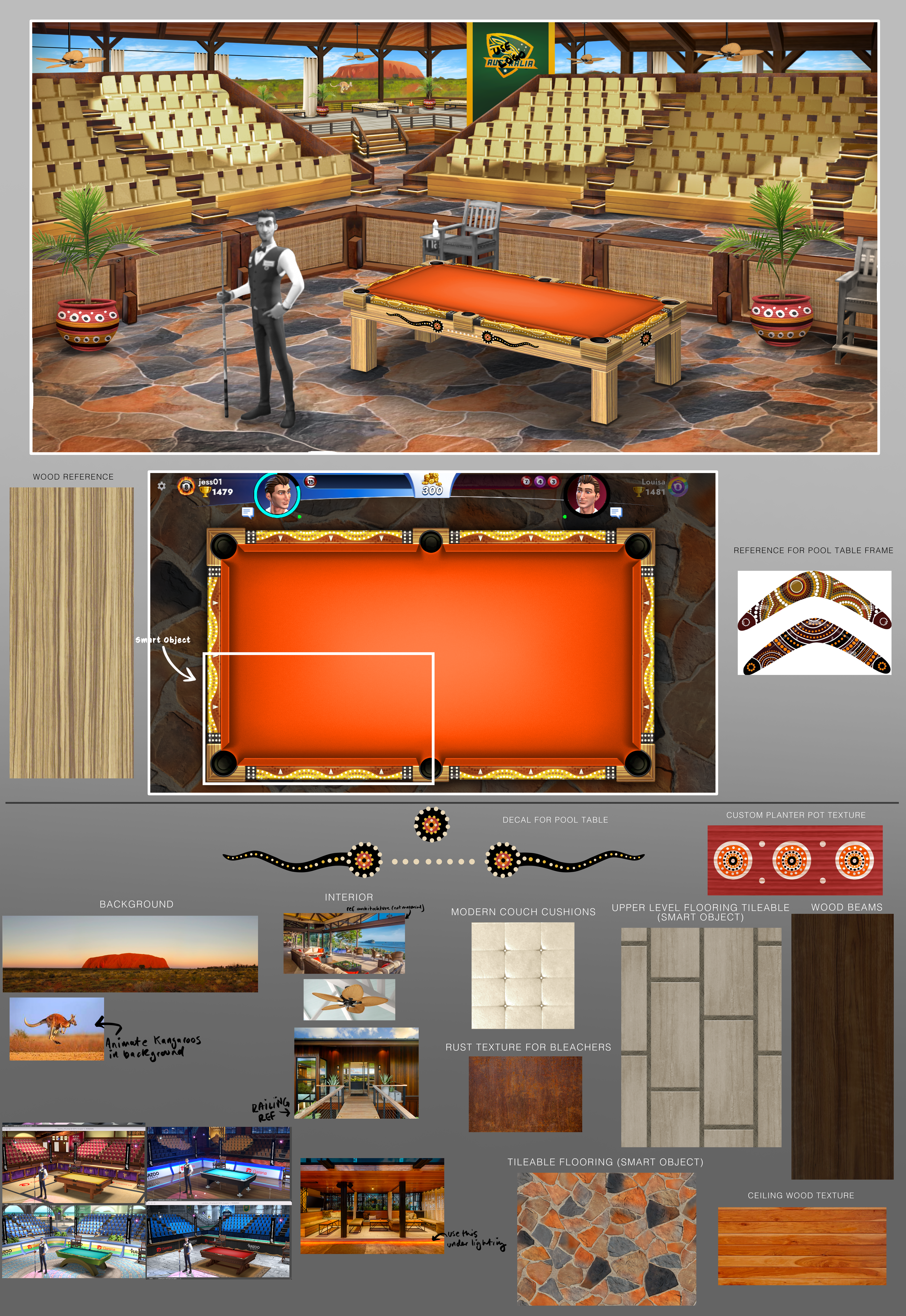 Pool table concept and final texture art I created. The top texture tiles four times to reduce file size, with each table and environment themed after a different city and country.