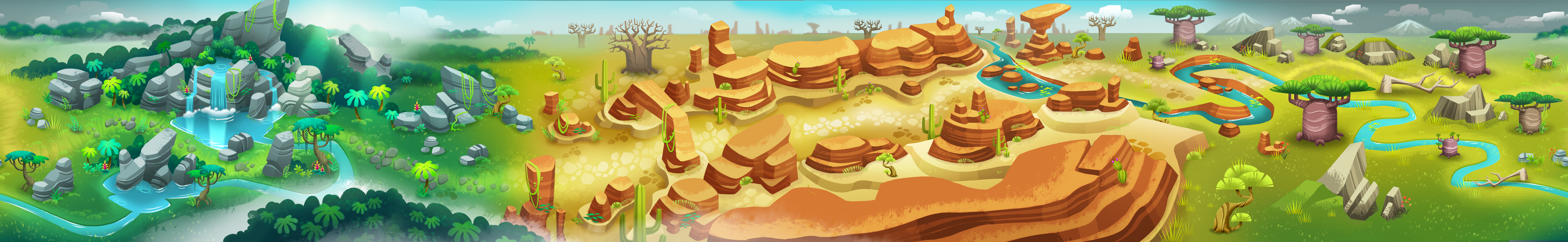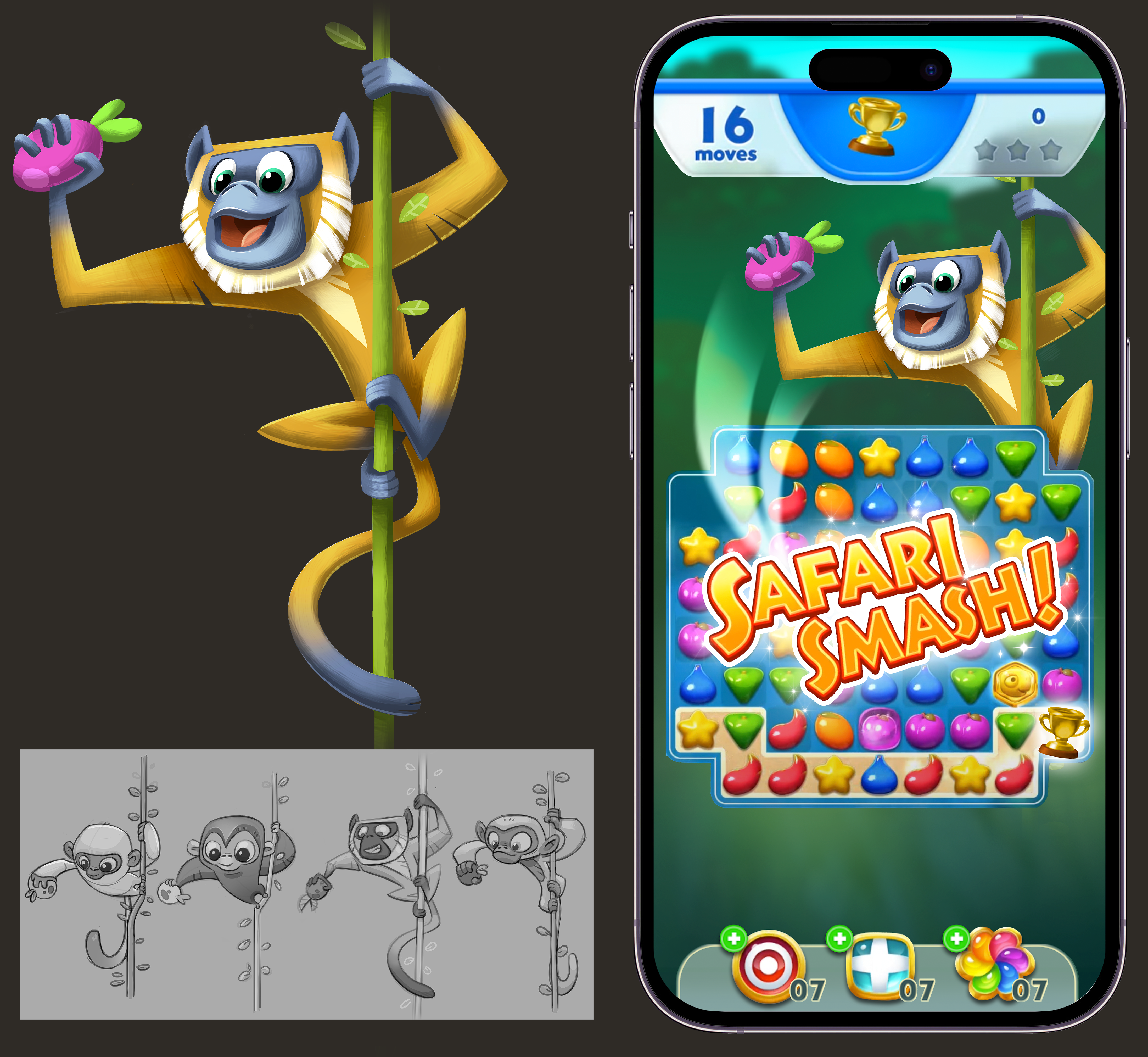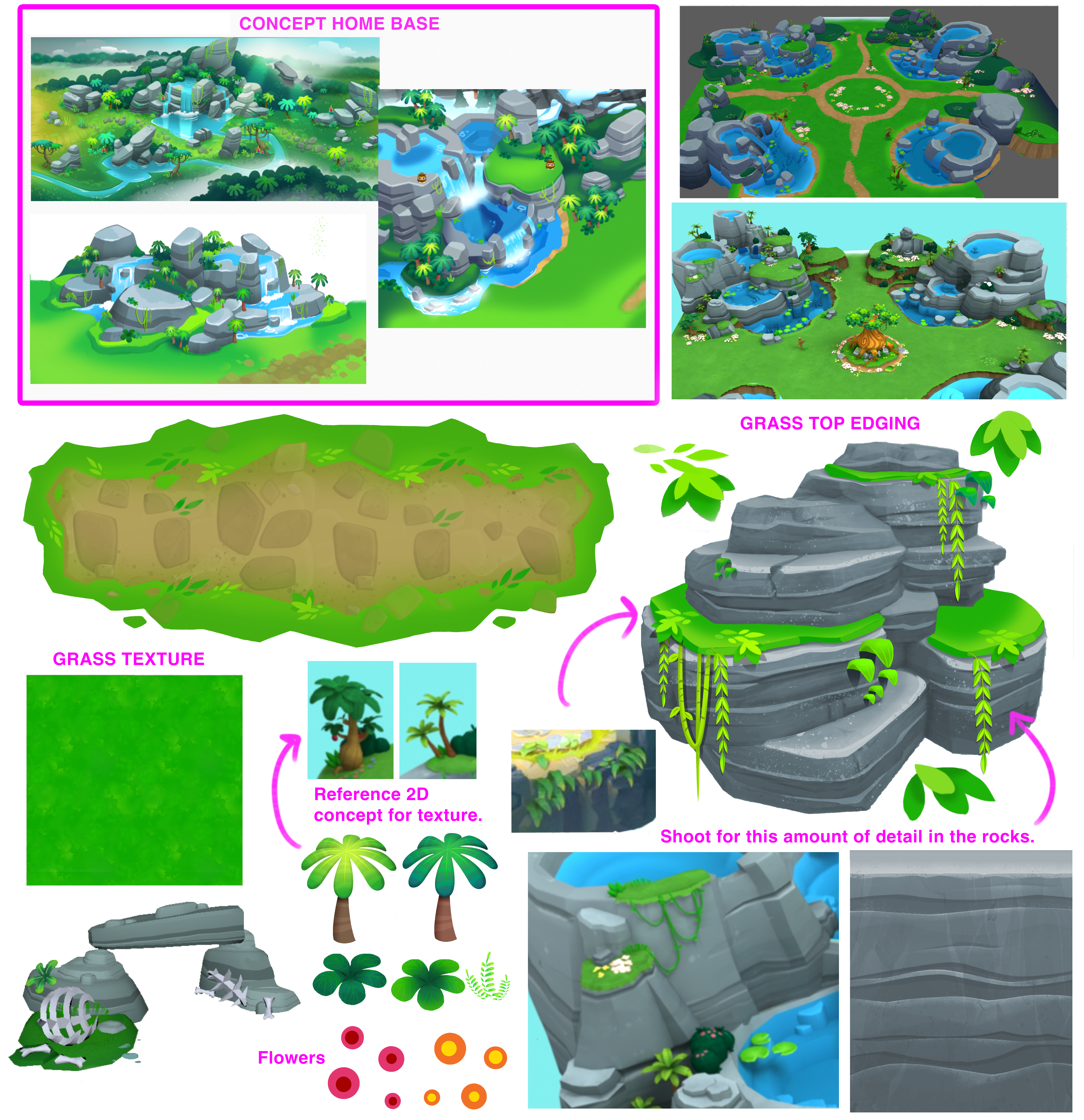 , (this loosely evolved into the Wild Things game) I was responsible for defining and executing the visual style of the game, from early concept to final in-game assets. I created concept art for environments, characters, and game elements, while also managing asset production to meet tight deadlines. I collaborated with 2D, 3D, and UI artists to ensure visual consistency across all content, and partnered with cross-functional teams to support feature development, live updates, and marketing initiatives.