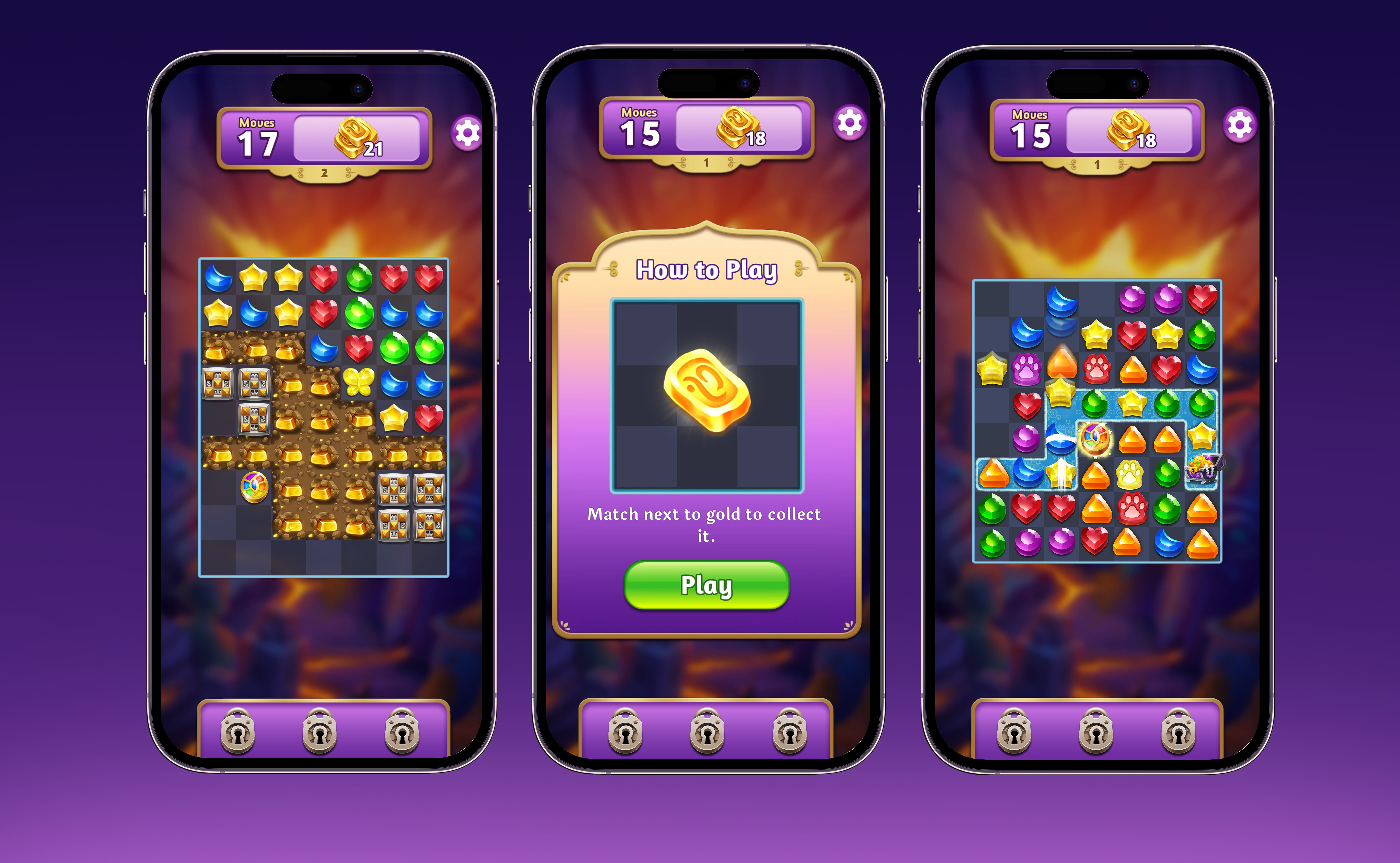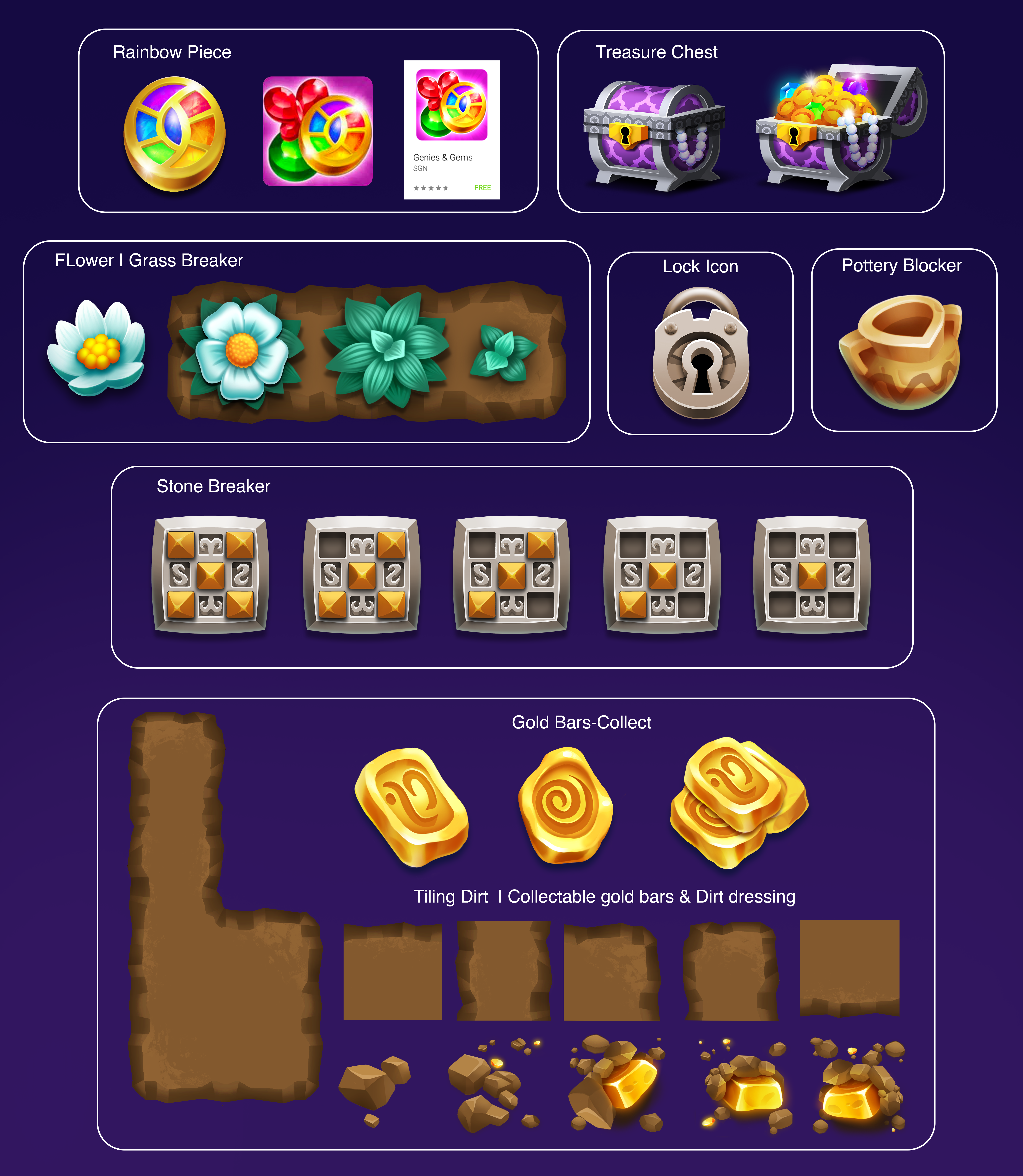 As Senior Artist on Genies & Gems, I helped define the visual language for the game’s foundational pieces, including tiling dirt blockers, the rainbow power piece, and multiple blocker systems. Match-3 blockers present unique challenges due to layered states and the need to clearly communicate progression across multiple break phases.