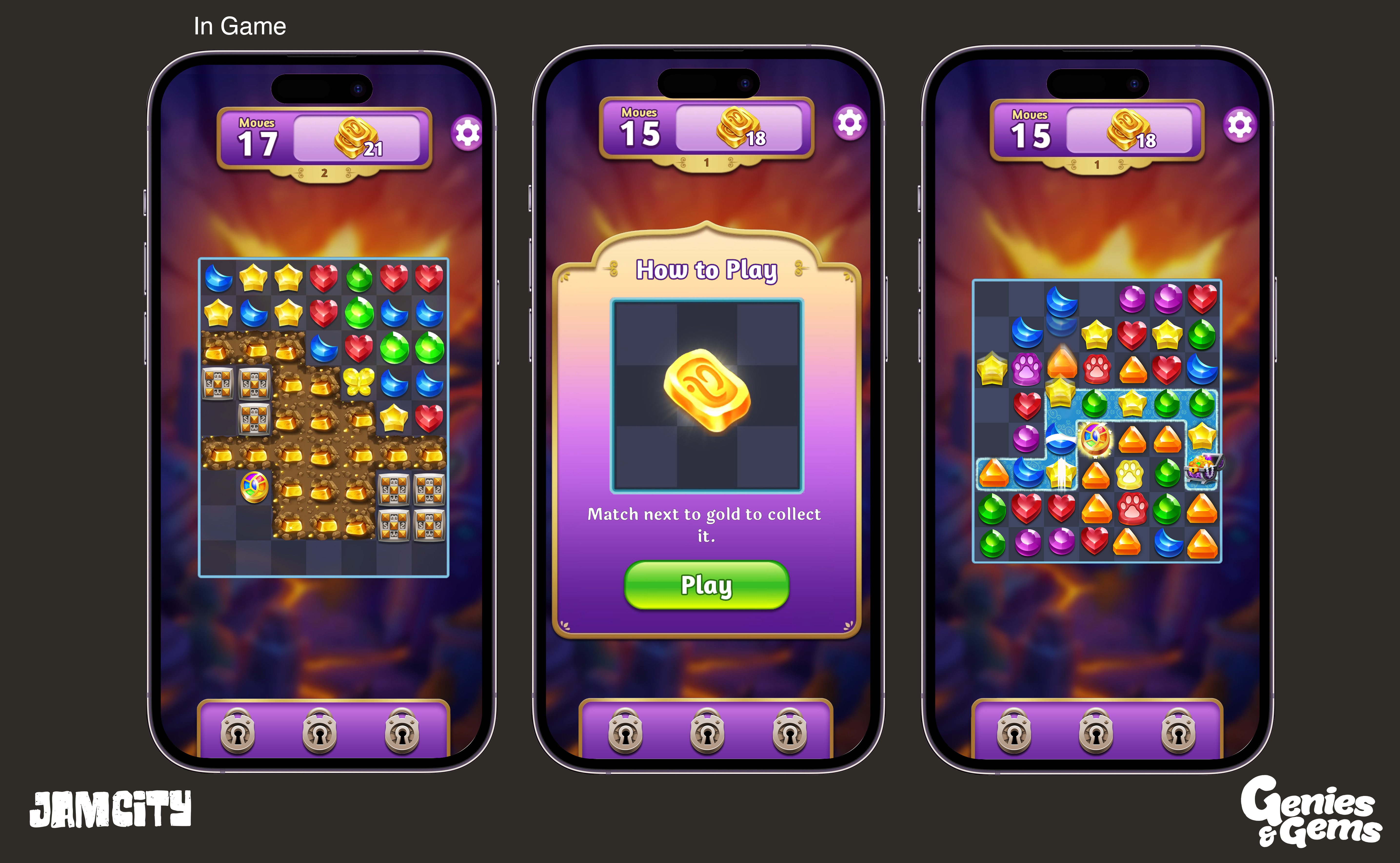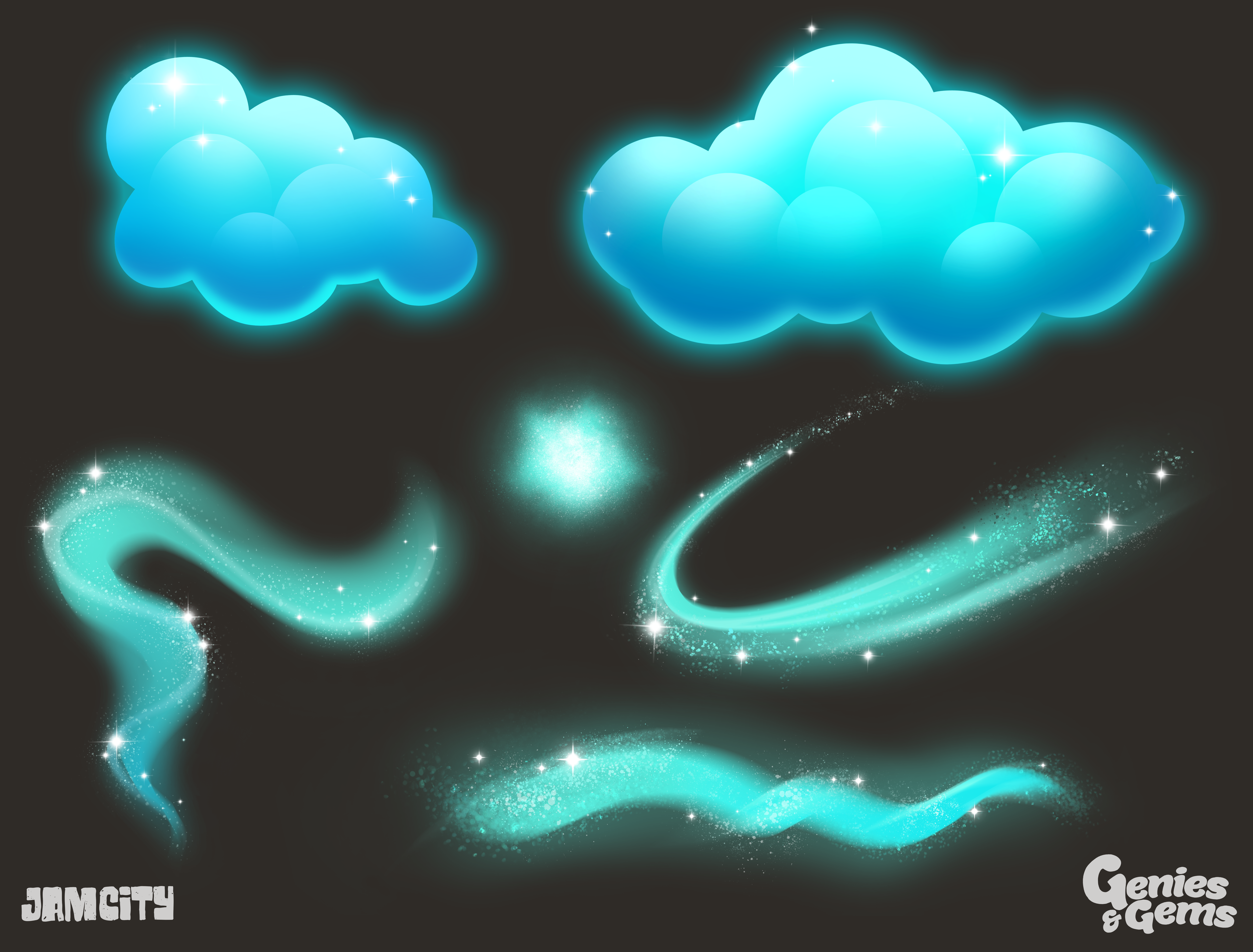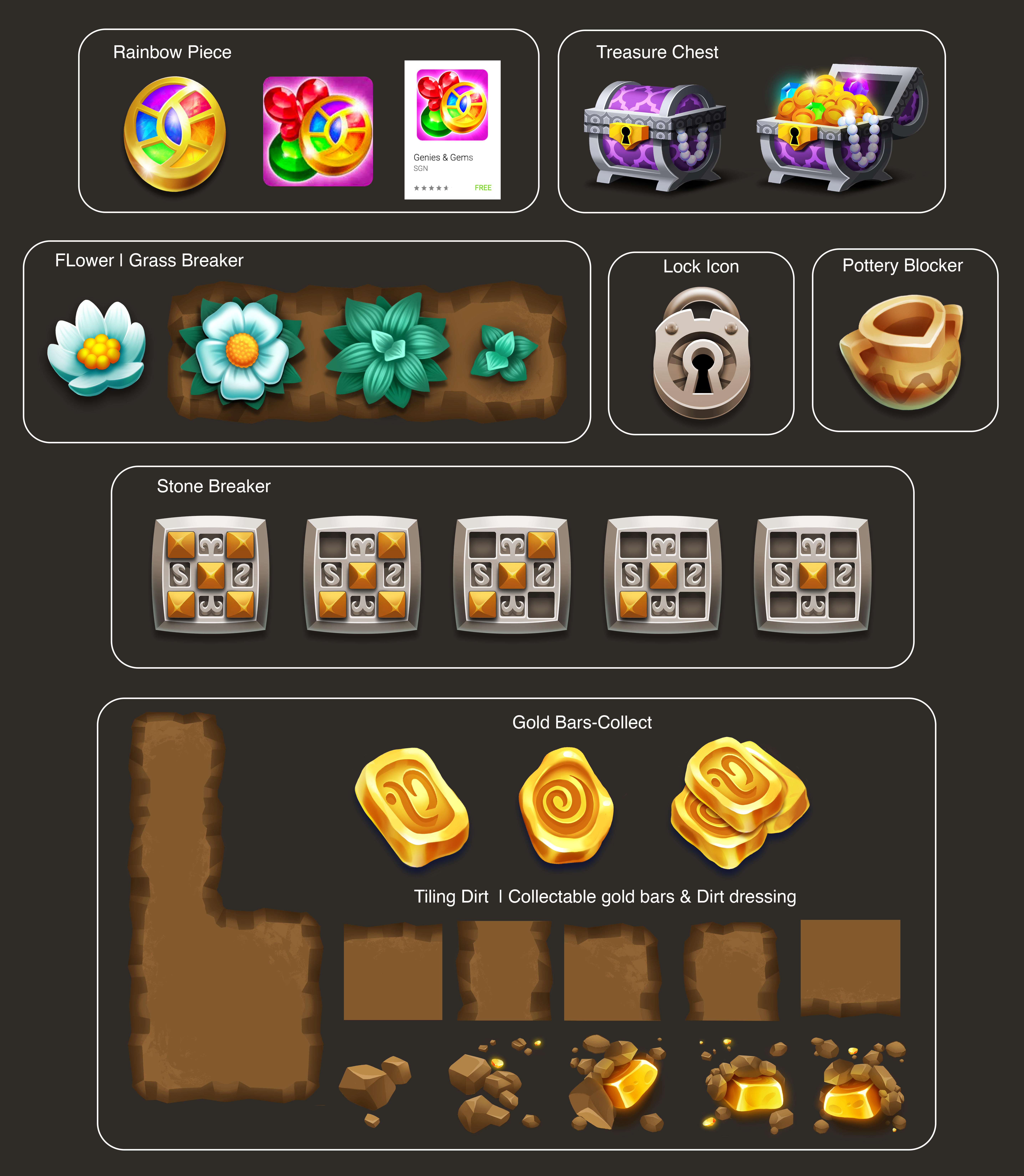 Genies & Gems is a Match3 game. These are some of the game pieces I designed and created.