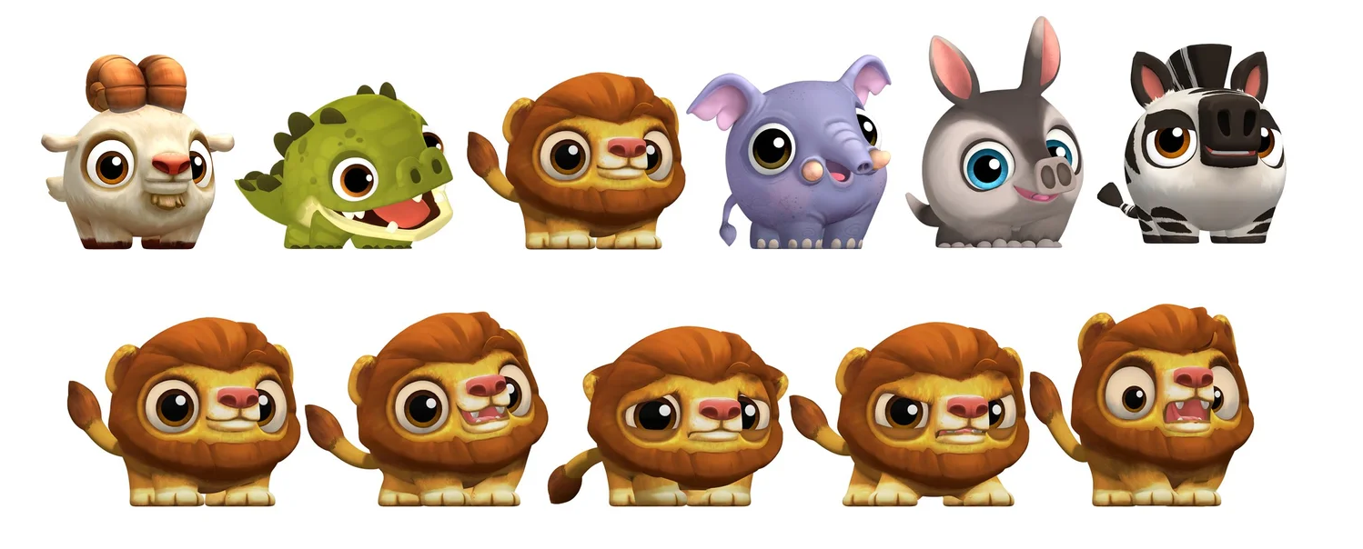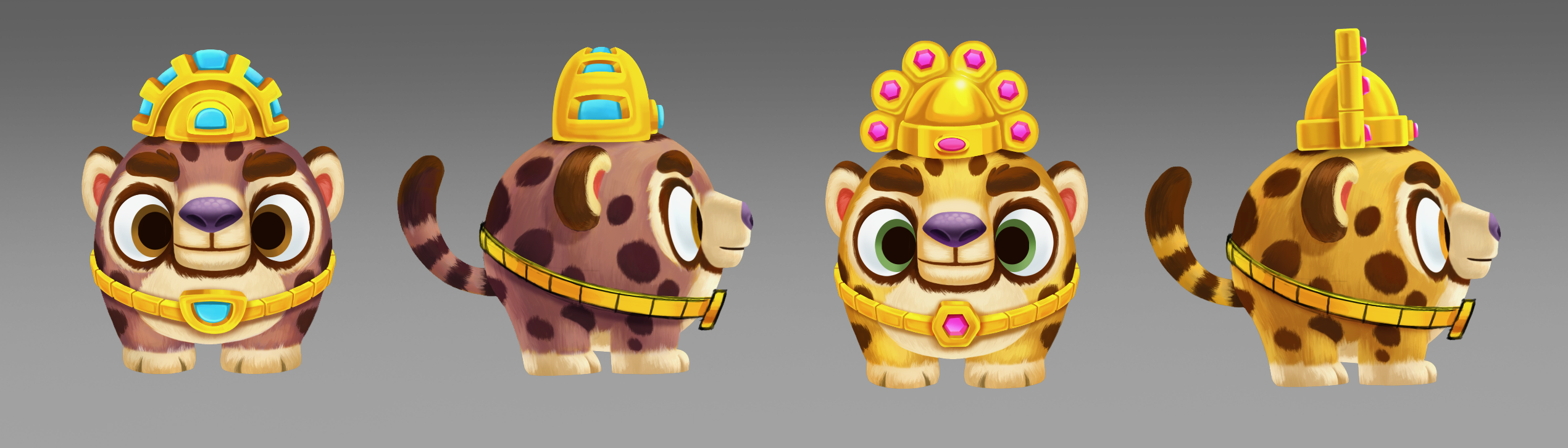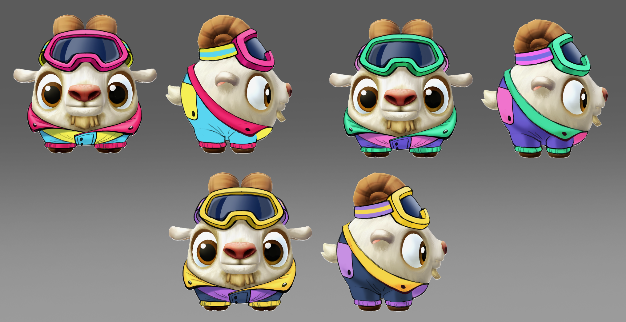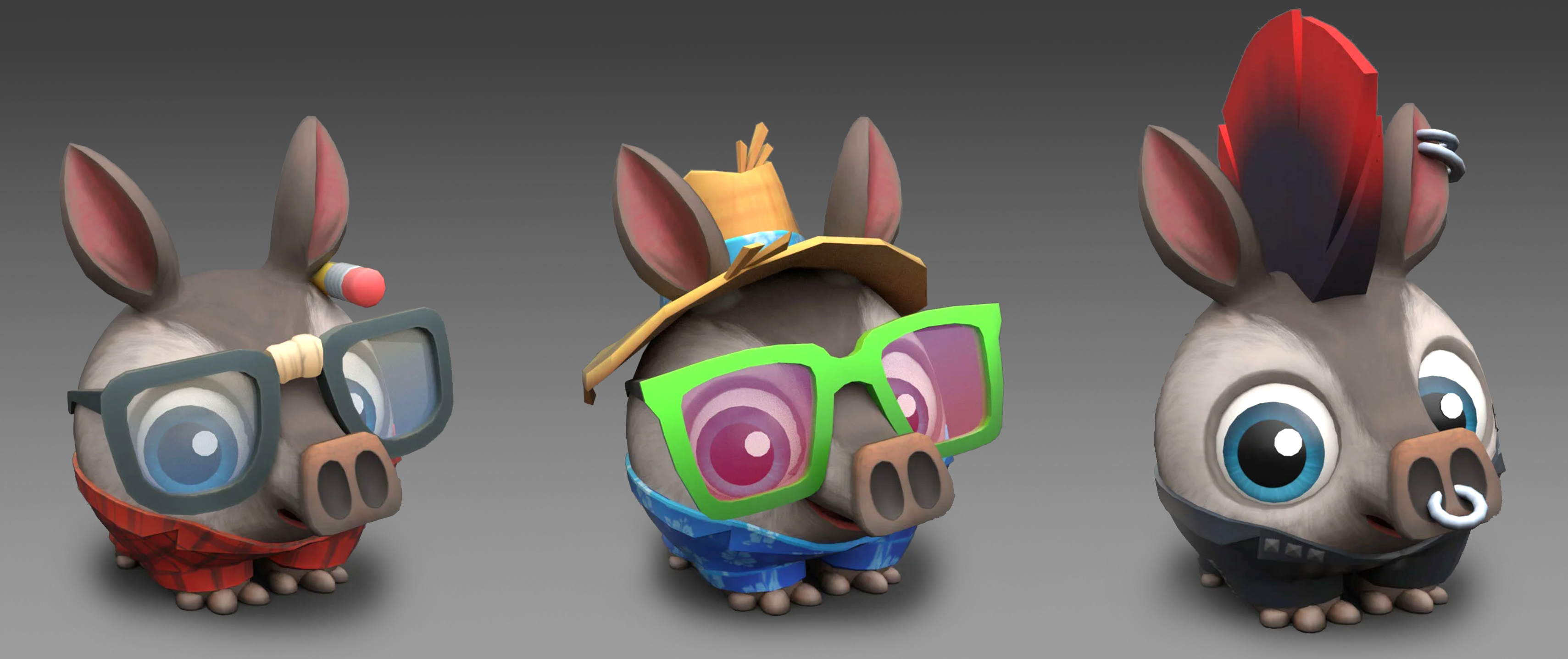 Example of character wearables. Players can choose one full outfit for their character. We used a neutral base shirt that could be reskinned to save on modeling and rigging time. Each character has a few head attach-points for accessories like hats, glasses, or other fun additions.